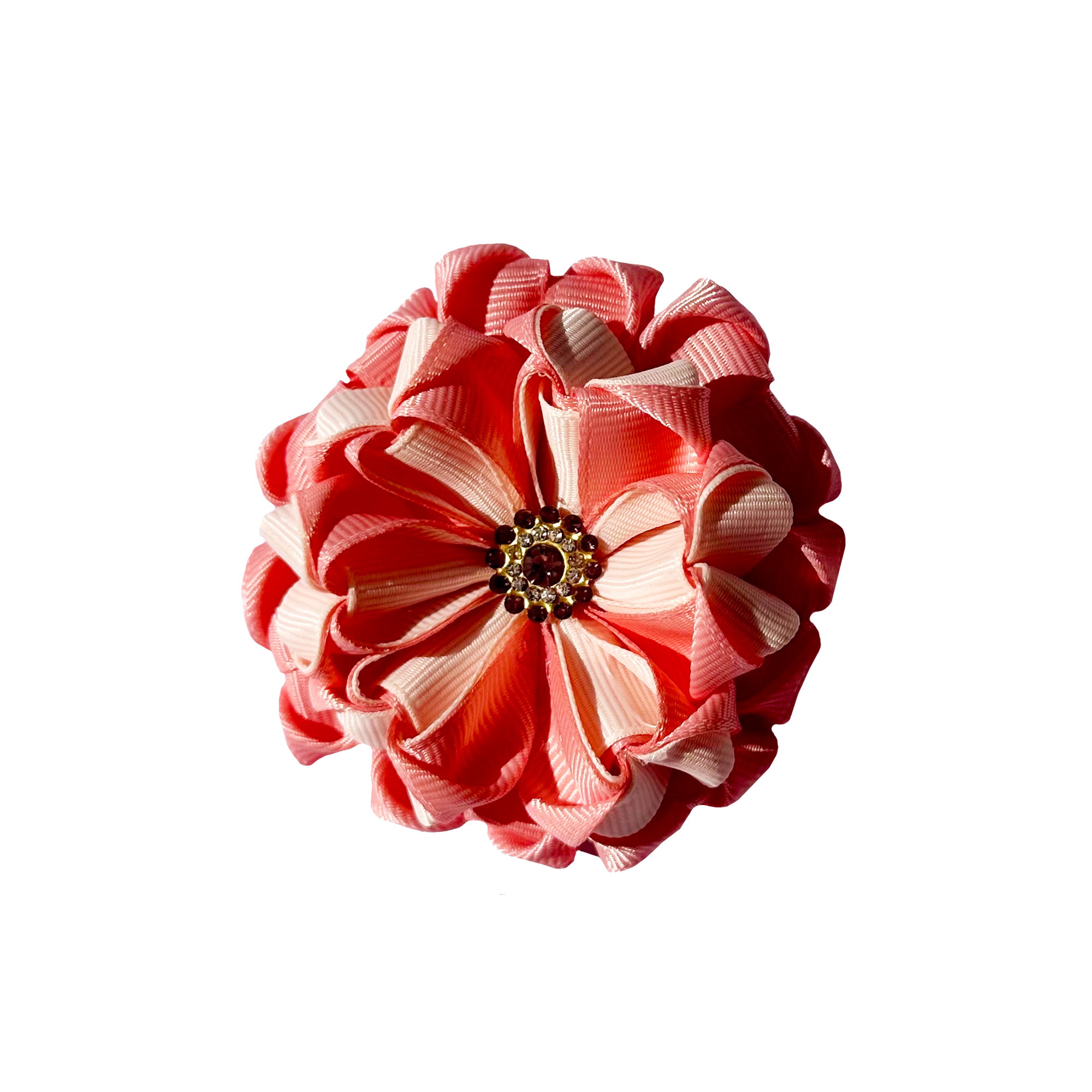 This stunning, full-bodied bow features a beautiful ombré effect, blending rich coral tones with soft peach grosgrain ribbon. Meticulously layered to create a lush, multi-petaled floral design, it is finished with a striking ruby-toned gemstone center framed by a halo of sparkling rhinestones.