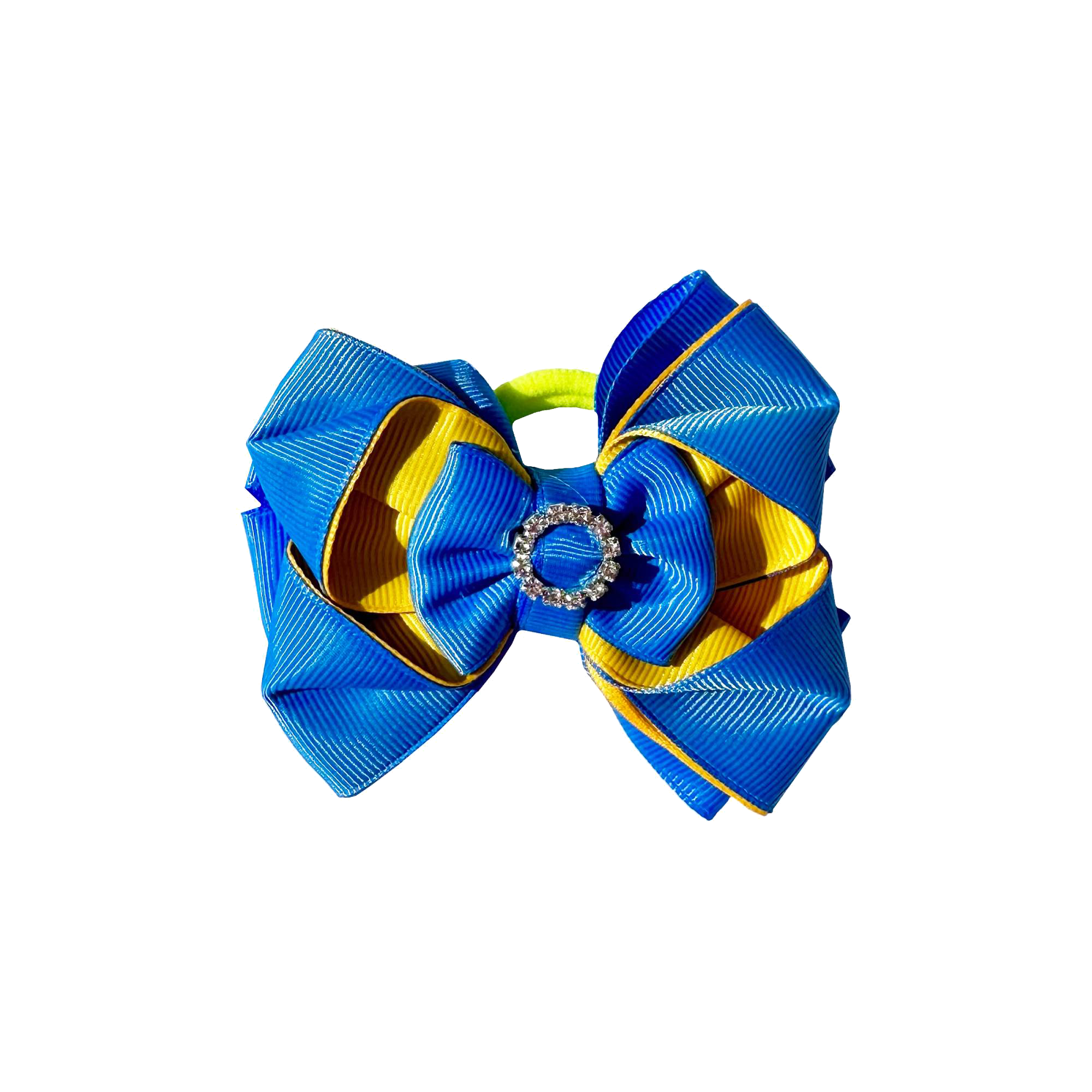 This high-contrast beauty features a striking combination of vibrant electric blue and sun-kissed yellow grosgrain ribbon. The expertly layered, voluminous loops create a bold silhouette that is perfectly finished with a dazzling circular rhinestone center, catching the light with every twist and turn.