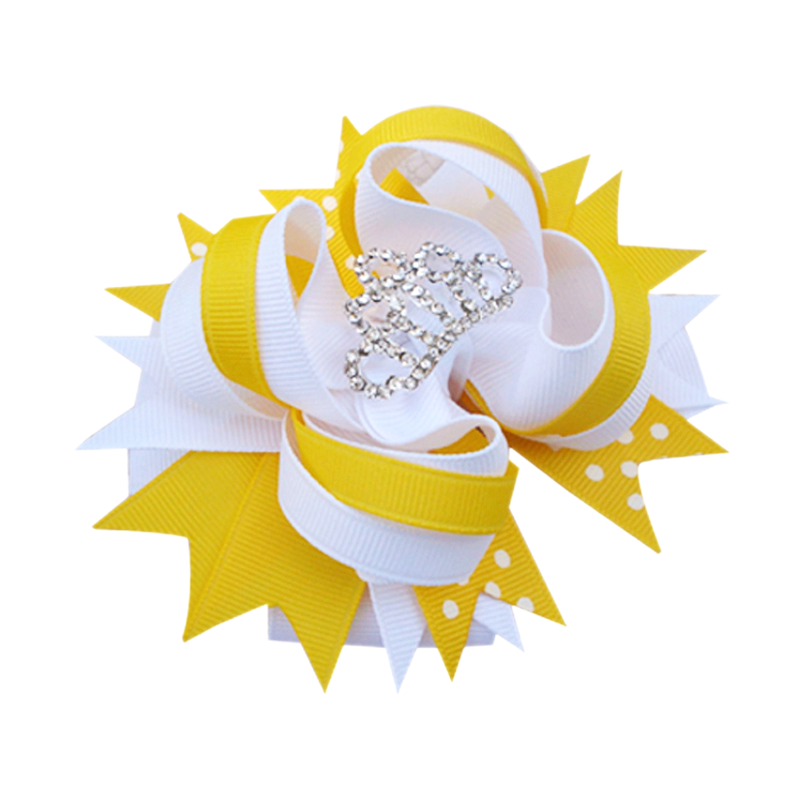 A burst of joy and royal elegance, this high-volume boutique bow is the perfect accessory for the little girl who shines wherever she goes. Meticulously handcrafted with premium grosgrain ribbon, it features a vibrant palette of sunny yellow and crisp white. The design is full of playful character, incorporating fun white polka-dot patterns on the “spiky” boutique tails for a modern, energetic look.