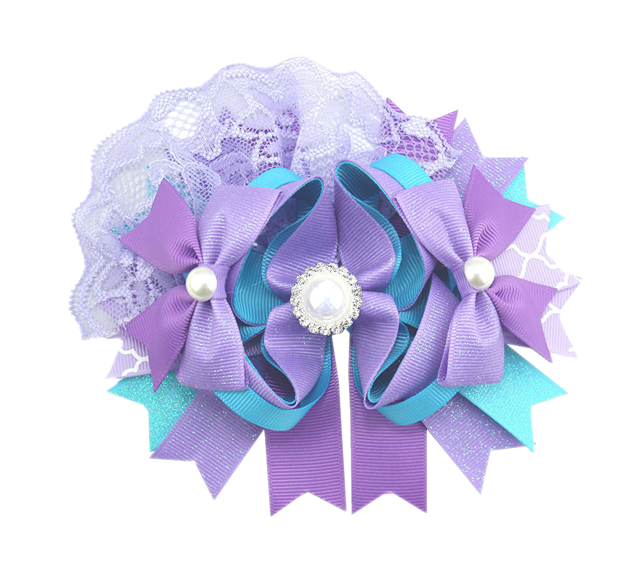 This stunning, high-volume accessory is the ultimate statement piece for skaters, dancers, or pageantry. Meticulously handcrafted, it features a grand foundation of delicate lavender lace, beautifully layered with a mix of lilac and vibrant teal grosgrain ribbons. The design is infused with a subtle, all-over shimmer that catches the light with every movement.