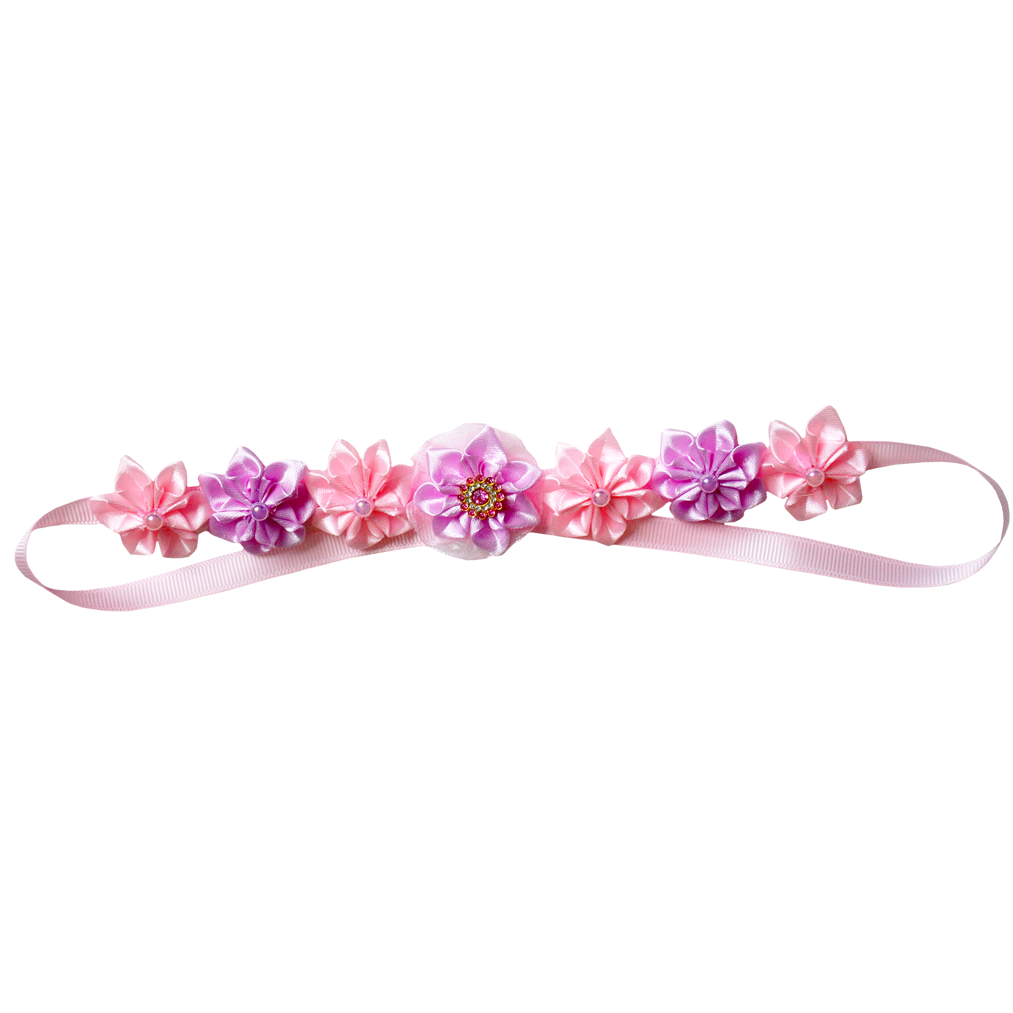 Specifically designed to wrap elegantly around gymnastics and dance buns, this headband adds a sophisticated floral touch to your performance hairstyle. It features an alternating sequence of handcrafted pointed-petal blossoms in soft baby pink and vibrant orchid purple. The centerpiece is a multi-layered floral focal point accented with a sparkling gold and rhinestone center for a professional, championship finish.