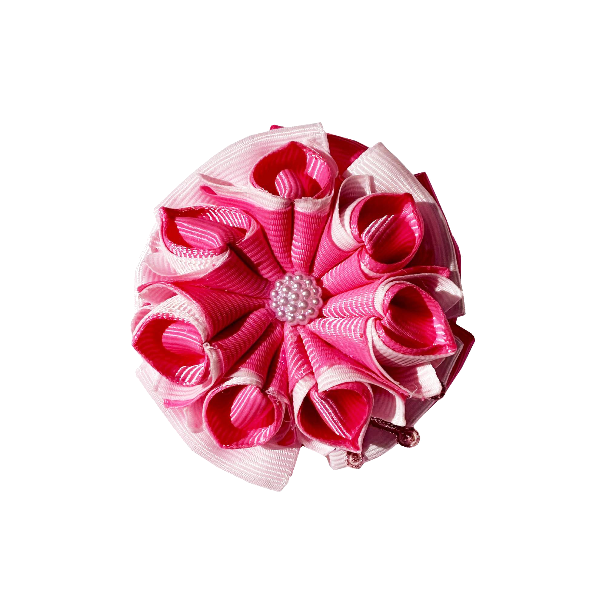 This intricately designed piece features a stunning “kanzashi-inspired” floral pattern, using vibrant hot pink and soft baby pink grosgrain ribbons. Each petal is meticulously folded to create a symmetrical, high-definition blossom that radiates from the center. A delicate, pearlescent beaded cluster sits at the heart of the bow, adding a touch of classic elegance to the bold, modern colors.